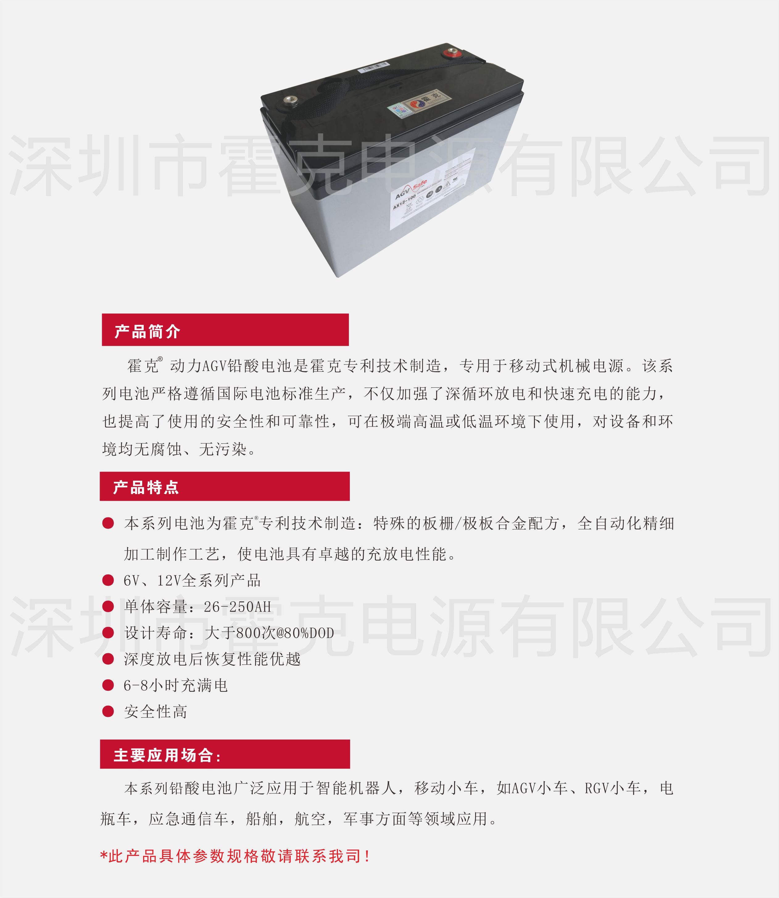 霍克動力AGV鉛酸電池是霍克專利技術制造,專用于移動式機械電源。該系列電池嚴格遵循國際電池標準生產(chǎn),不僅加強了深循環(huán)放電和快速充電的能力,也提高了使用的安全性和可靠性,可在極端高溫或低溫環(huán)境下使用,對設備和環(huán)境均無腐蝕、無污染。